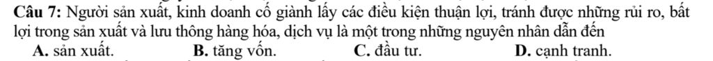 Câu 7: Người sản xuất, kinh doanh cố giành lấy các điều kiện thuận lợi, tránh được những rủi ro, bất lợi trong sản xuất và lưu thông hàng hóa, dịch vụ là một trong những nguyên nhân dẫn đến