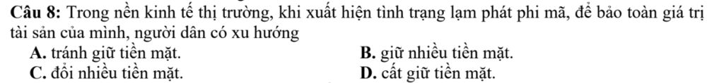 Câu 8: Trong nền kinh tế thị trường, khi xuất hiện tình trạng lạm phát phi mã, để bảo toàn giá trị tài sản của mình, người dân có xu hướng