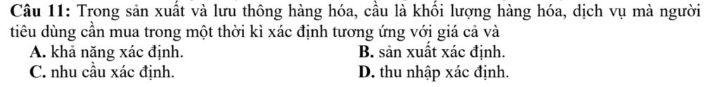 Câu 11: Trong sản xuất và lưu thông hàng hóa, cầu là khối lượng hàng hóa, dịch vụ mà người tiêu dùng cần mua trong một thời kì xác định tương ứng với giá cả và