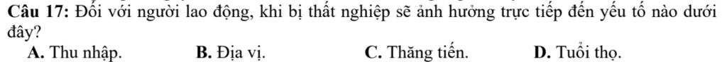 Câu 17: Đối với người lao động, khi bị thất nghiệp sẽ ảnh hưởng trực tiếp đến yếu tố nào dưới dây?