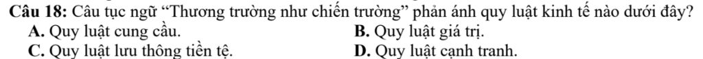Câu 18: Câu tục ngữ “Thương trường như chiến trường” phản ánh quy luật kinh tế nào dưới đây?