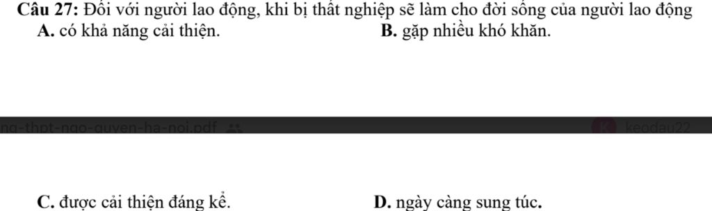 Câu 27: Đối với người lao động, khi bị thất nghiệp sẽ làm cho đời sống của người lao động