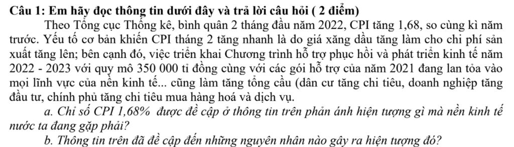 Câu 1: Em hãy đọc thông tin dưới đây và trả lời câu hỏi ( 2 điểm) Theo Tổng cục Thống kê, bình quân 2 tháng đầu năm 2022, CPI tăng 1,68, so cùng kì năm trước. Yếu tố cơ bản khiến CPI tháng 2 tăng nhanh là do giá xăng dầu tăng làm cho chi phí sản xuất tăng lên; bên cạnh đó, việc triển khai Chương trình hỗ trợ phục hồi và phát triển kinh tế năm 2022 - 2023 với quy mô 350 000 tỉ đồng cùng với các gói hỗ trợ của năm 2021 đang lan tỏa vào mọi lĩnh vực của nền kinh tế... cũng làm tăng tổng cầu (dân cư tăng chi tiêu, doanh nghiệp tăng đầu tư, chính phủ tăng chi tiêu mua hàng hoá và dịch vụ.