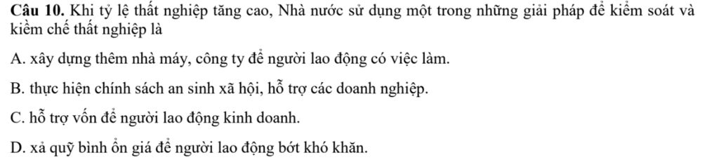 Cậu 10. Khi tỷ lệ thất nghiệp tăng cao, Nhà nước sử dụng một trong những giải pháp để kiểm soát và kiềm chế thất nghiệp là