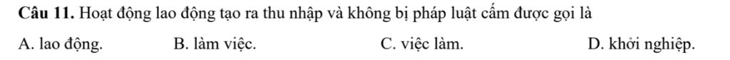 Câu 11. Hoạt động lao động tạo ra thu nhập và không bị pháp luật cấm được gọi là