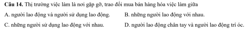 Câu 14. Thị trường việc làm là nơi gặp gỡ, trao đổi mua bán hàng hóa việc làm giữa
