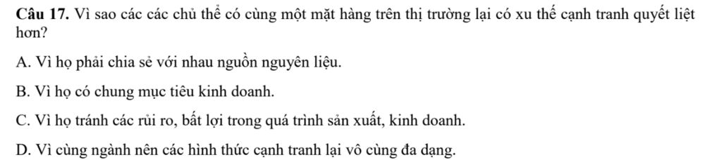 Câu 17. Vì sao các các chủ thể có cùng một mặt hàng trên thị trường lại có xu thế cạnh tranh quyết liệt hơn?