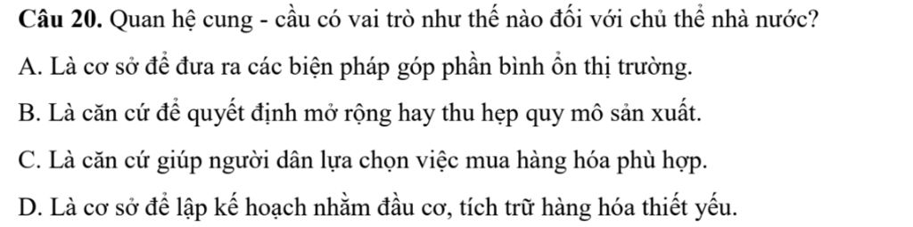 Câu 20. Quan hệ cung - cầu có vai trò như thế nào đối với chủ thể nhà nước?