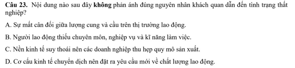 Câu 23. Nội dung nào sau đây không phản ánh đúng nguyên nhân khách quan dẫn đến tình trạng thất nghiệp?