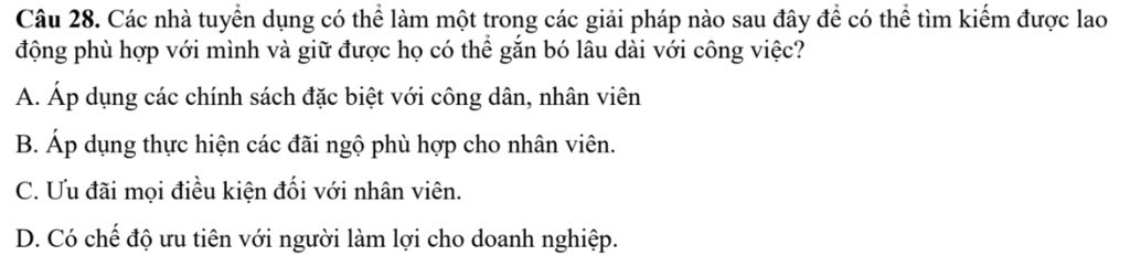Câu 28. Các nhà tuyển dụng có thể làm một trong các giải pháp nào sau đây để có thể tìm kiếm được lao động phù hợp với mình và giữ được họ có thể gắn bó lâu dài với công việc?
