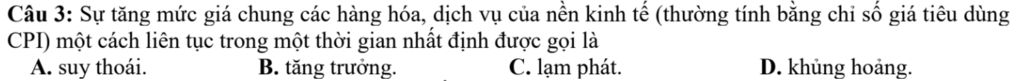 Câu 3: Sự tăng mức giá chung các hàng hóa, dịch vụ của nền kinh tế (thường tính bằng chỉ số giá tiêu dùng CPI) một cách liên tục trong một thời gian nhất định được gọi là