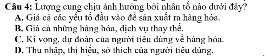 Câu 4: Lượng cung chịu ảnh hưởng bởi nhân tố nào dưới đây?