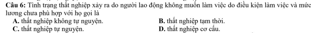 Câu 6: Tình trạng thất nghiệp xảy ra do người lao động không muốn làm việc do điều kiện làm việc và mức lương chưa phù hợp với họ gọi là