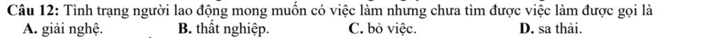 Câu 12: Tình trạng người lao động mong muốn có việc làm nhưng chưa tìm được việc làm được gọi