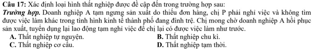 Câu 17: Xác định loại hình thất nghiệp được đề cập đến trong trường hợp sau: Trường hợp. Doanh nghiệp A tạm ngưng sản xuất do thiếu đơn hàng, chị P phải nghỉ việc và không tìm được việc làm khác trong tình hình kinh tế thành phố đang đình trệ. Chị mong chờ doanh nghiệp A hồi phục sản xuất, tuyển dụng lại lao động tạm nghỉ việc để chị lại có được việc làm như trước.