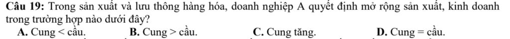 Câu 19: Trong sản xuất và lưu thông hàng hóa, doanh nghiệp A quyết định mở rộng sản xuất, kinh doanh trong trường hợp nào dưới đây?