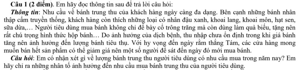 Câu 1 (2 điểm). Em hãy đọc thông tin sau để trả lời câu hỏi: Thông tin: Nhu cầu về bánh trung thu của khách hàng ngày càng đa dạng. Bên cạnh những bánh nhân thập cẩm truyền thống, khách hàng còn thích những loại có nhân đậu xanh, khoai lang, khoai môn, hạt sen, sữa dừa,... Người tiêu dùng mua bánh không chỉ để bày cổ trông trăng mà còn dùng làm quà biếu, tặng nên rất chú trọng hình thức hộp bánh... Do ảnh hưởng của dịch bệnh, thu nhập chưa ổn định trong khi giá bánh tăng nên ảnh hưởng đến lượng bánh tiêu thụ. Với hy vọng đến ngày rằm thắng Tám, các cửa hàng mong muốn bán hết sản phẩm có thể giảm giá nên một số người để sát đến ngày đó mới mua bánh.