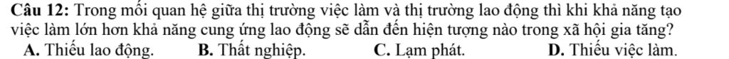 Câu 12: Trong mối quan hệ giữa thị trường việc làm và thị trường lao động thì khi khả năng tạo việc làm lớn hơn khả năng cung ứng lao động sẽ dẫn đến hiện tượng nào trong xã hội gia tăng?