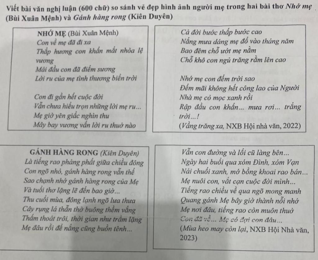 Viết bài văn nghị luận (600 chữ) so sánh vẻ đẹp hình ảnh người mẹ trong hai bài thơ Nhớ mẹ