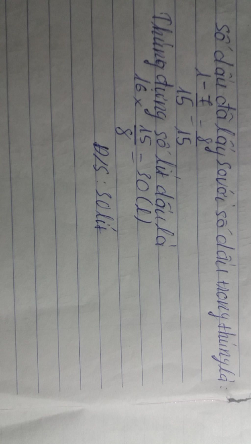 Sau khi lấy đi 16 lít thì số dầu còn lại bằng 7/15 số dầu trong thùng nên 16 lít dầu tương ứng bằng: