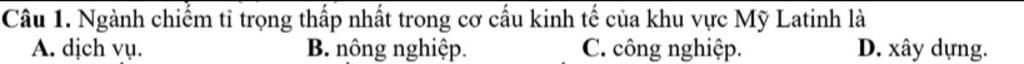Câu 1. Ngành chiếm tỉ trọng thấp nhất trong cơ cấu kinh tế của khu vực Mỹ Latinh làA. dịch vụ. B. nông nghiệp. C. công nghiệp. D. xây dựng.