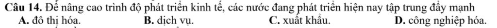 Câu 14. Để nâng cao trình độ phát triển kinh tế, các nước đang phát triển hiện nay tập trung đẩy mạnh
