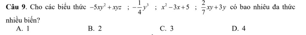 Câu 9. Cho các biểu thức `-5xy² + xyz ; 1/4y^3; x²-3x+5; 2/7xy+3y` có bao nhiêu đa thức nhiều biến?