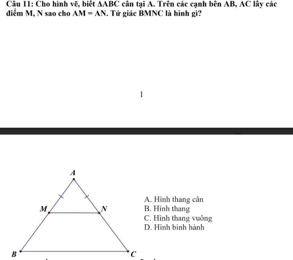 Câu 11: Cho hình vẽ, biết AABC cân tại A. Trên các cạnh bên AB, AC lấy các điểm M, N sao cho AM = AN. Tứ giác BMNC là hình gì?