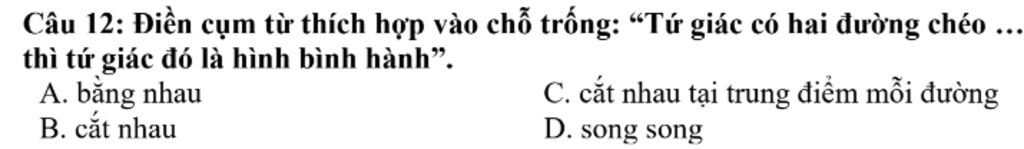 Câu 12: Điền cụm từ thích hợp vào chỗ trống: “Tứ giác có hai đường chéo ... thì tứ giác đó là hình bình hành”.