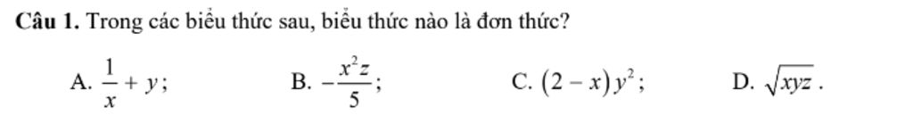 Câu 1. Trong các biểu thức sau, biểu thức nào là đơn thức?
