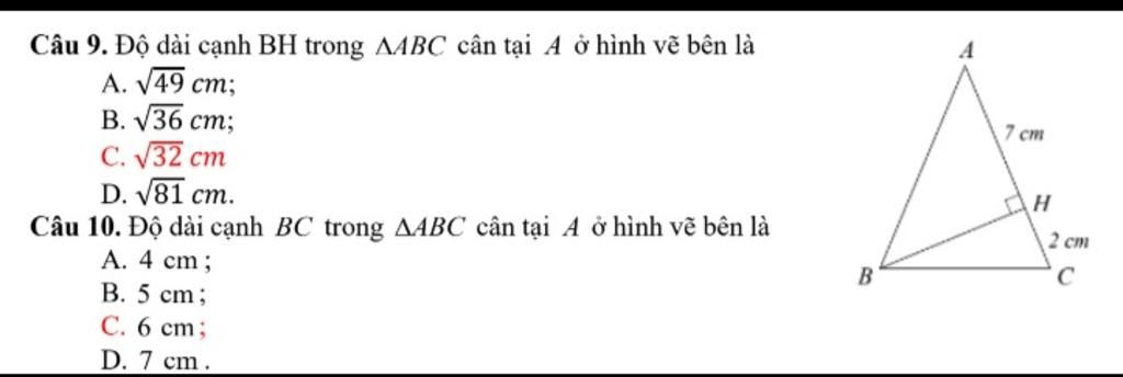 Câu 9. Độ dài cạnh BH trong A4BC cân tại A ở hình vẽ bên là