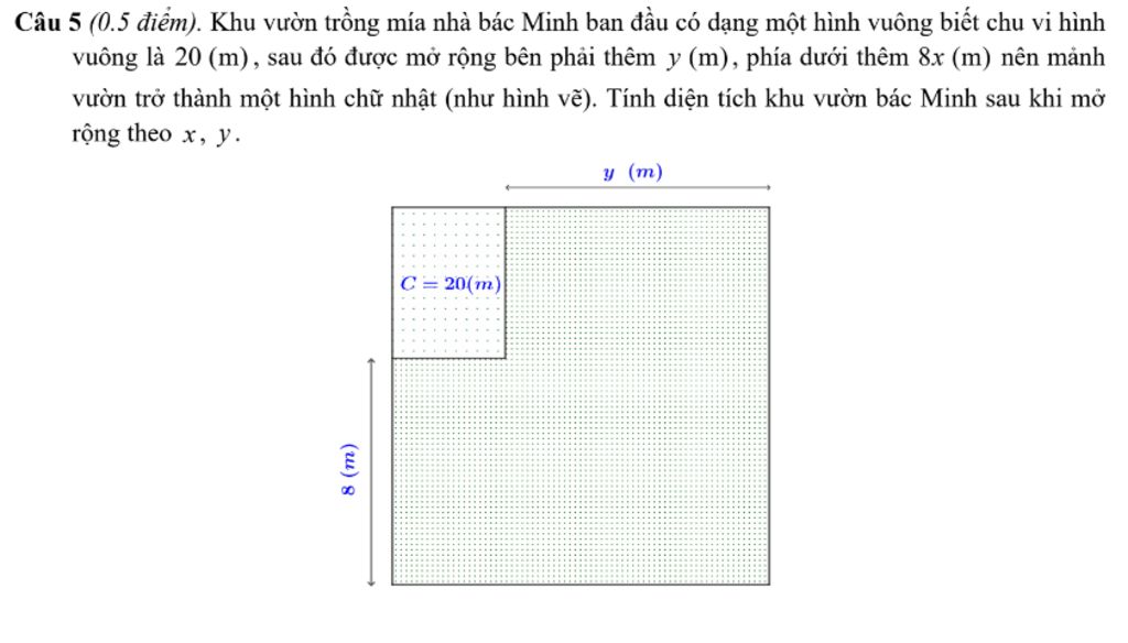 Câu 5 (0.5 điểm). Khu vườn trồng mía nhà bác Minh ban đầu có dạng một hình vuông biết chu vi hình vuông là 20 (m) , sau đó được mở rộng bên phải thêm y (m), phía dưới thêm 8 (m) x nên mảnh vườn trở thành một hình chữ nhật (như hình vẽ).