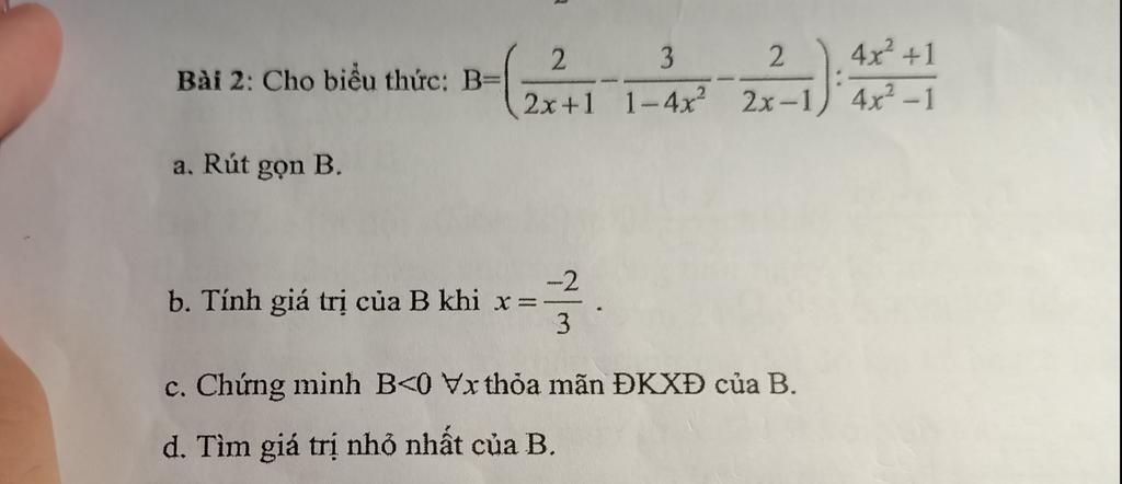 $\to B=(\dfrac{2\left(2x-1\right)}{\left(2x+1\right)\left(2x-1\right)}+\dfrac{3}{\left(2x+1\right)\left(2x-1\right)}-\dfrac{2\left(2x+1\right)}{\left(2x+1\right)\left(2x-1\right)}):\dfrac{4x^2+1}{4x^2-1}$