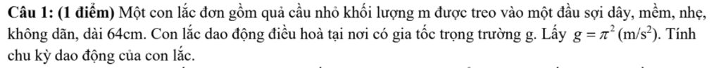 Câu 1: (1 điểm) Một con lắc đơn gồm quả cầu nhỏ khối lượng m được treo vào một đầu sợi dây, mềm, nhẹ, không dãn, dài 64cm. Con lắc dao động điều hoà tại nơi có gia tốc trọng trường g. Lấy g = $\pi ^2$ (m/$s^2$ ). Tính chu kỳ dao động của con lắc.