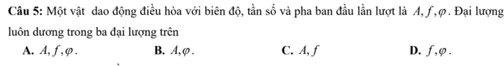 Câu 5: Một vật dao động điều hòa với biên độ, tần số và pha ban đầu lần lượt là A, f ,φ . Đại lượng luôn dương trong ba đại lượng trên