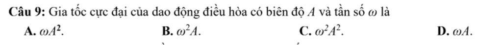 Câu 9: Gia tốc cực đại của dao động điều hòa có biên độ A và tần số ω là
