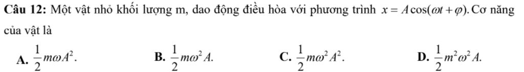 Câu 12: Một vật nhỏ khối lượng m, dao động điều hòa với phương trình x =Acos( ωt + φ). Cơ năng của vật là