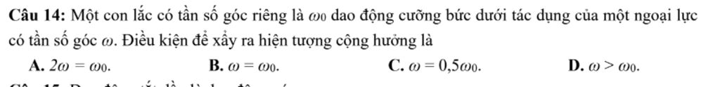 Một con lắc có tần số góc riêng là ω0 dao động cưỡng bức dưới tác dụng của một ngoại lực có tần số góc ω.Và `omega=omega_0`