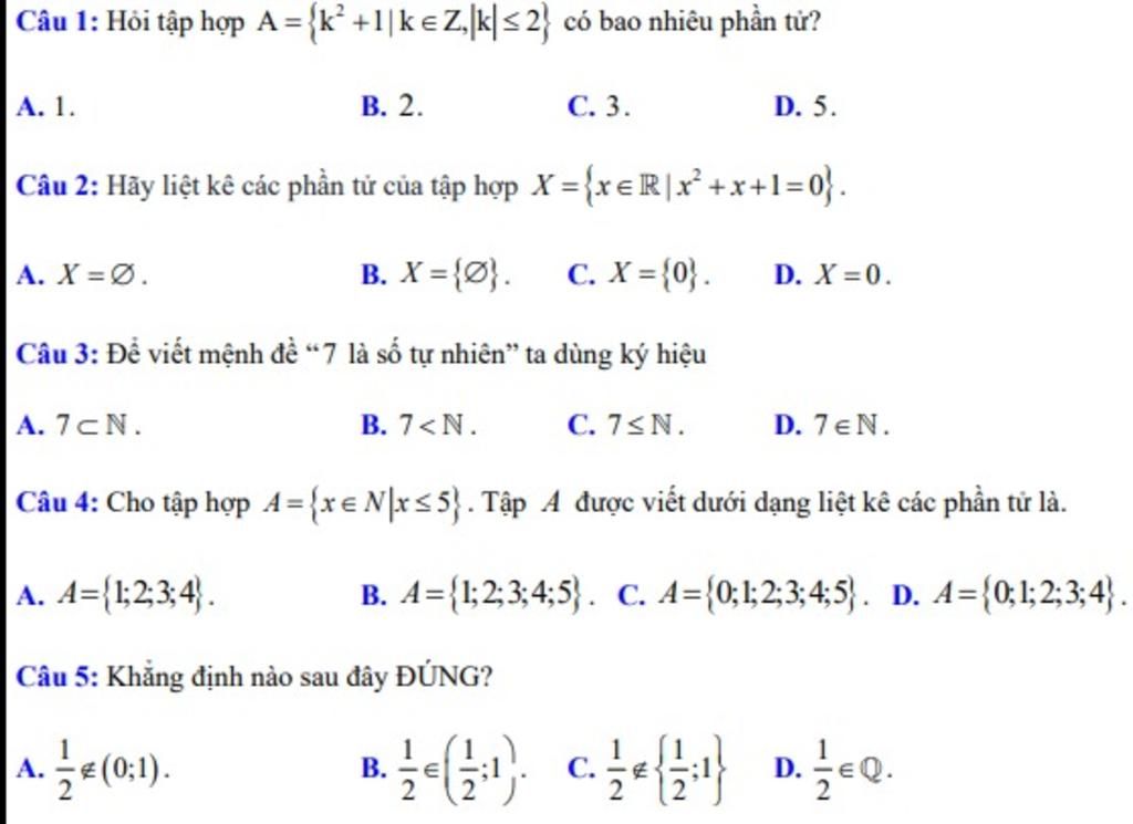 Câu 1: Hỏi tập hợp A={k+l|k=Z|k|s2 có bao nhiêu phần tử?