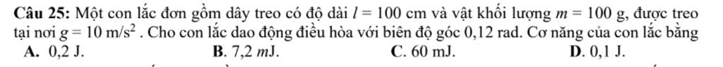 Câu 25: Một con lắc đơn gồm dây treo có độ dài l = 100 cm và vật khối lượng m = 100 g, được treo tại nơi g = 10 m/$s^2$ . Cho con lắc dao động điều hòa với biên độ góc 0,12 rad. Cơ năng của con lắc bằng