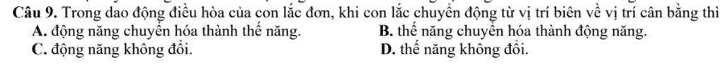 Câu 9. Trong dao động điều hòa của con lắc đơn, khi con lắc chuyển động từ vị trí biên về vị trí cân bằng thì