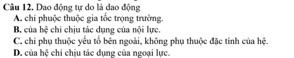 Dao động tự do là Dao động mà chu kì dao động của hệ chỉ phụ thuộc vào đặc tính của hệ và không phụ thuộc vào các yếu tố bên ngoài