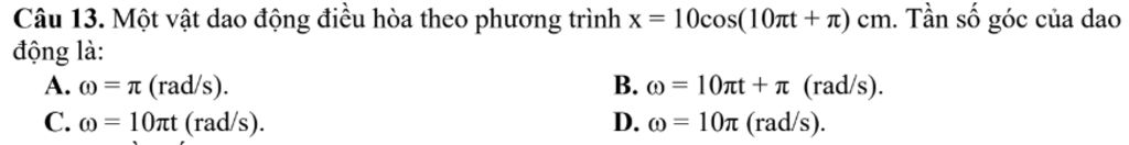 Câu 13. Một vật dao động điều hòa theo phương trình x = 10cos(10πt + π) cm. Tần số góc của dao động là: