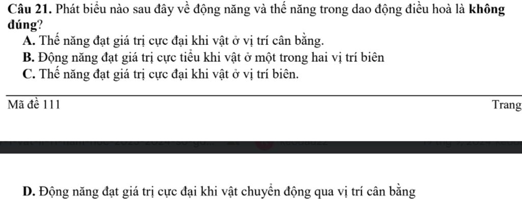 Câu 21. Phát biểu nào sau đây về động năng và thế năng trong dao động điều hoà là không đúng?