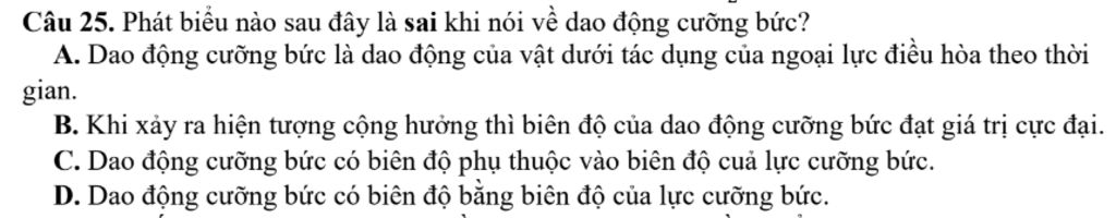Câu 25. Phát biểu nào sau đây là sai khi nói về dao động cưỡng bức?