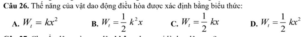 Câu 26. Thế năng của vật dao động điều hòa được xác định bằng biểu thức: