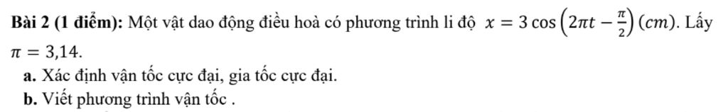 Bài 2 (1 điểm): Một vật dao động điều hoà có phương trình li độ x = 3cos (2πt − π/2) (cm). Lấy π = 3,14.