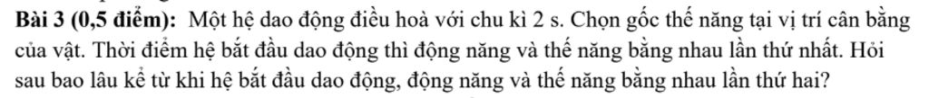Bài 3 (0,5 điểm): Một hệ dao động điều hoà với chu kì 2 s. Chọn gốc thế năng tại vị trí cân bằng của vật. Thời điểm hệ bắt đầu dao động thì động năng và thế năng bằng nhau lần thứ nhất. Hỏi sau bao lâu kể từ khi hệ bắt đầu dao động, động năng và thế năng bằng nhau lần thứ hai?