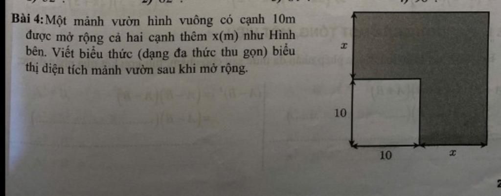 `(10+x)(10+x) = 100 + 10x + 10x + x^2 = x^2 +20x + 100(m^2)`