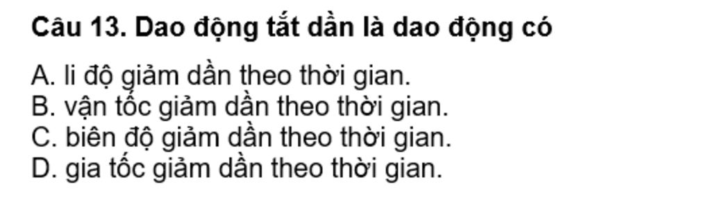 Dao động tắt dần là loại dao động mà biên độ giảm dần theo thời gian do sự tiêu tán năng lượng (thường là do lực cản của môi trường). Khi biên độ giảm, điều này cũng dẫn đến sự giảm dần của li độ và vận tốc theo thời gian.